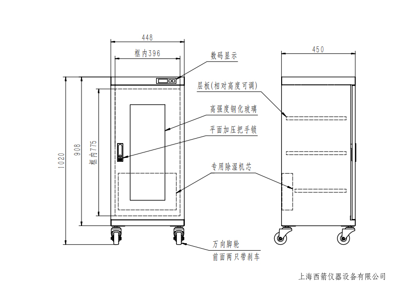 3.防潮箱門玻璃區域選用3.0mm鋼化玻璃,防前傾耳式結構設計。帶平面加壓把手鎖*體化設計,有防盜功能。D部安裝可移動帶剎車腳輪方便移動及固定(防靜電機型腳輪為防靜電)。